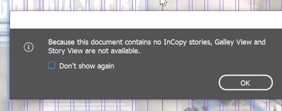 We have users that create InDesign files on Macs and users on PC that open those files in InCopy. Recently a file that was created on a Mac in InDesign is showing an error when users on PC try to open it in InCopy. The error message states, "Because this document contains no InCopy stories, Galley View and Story View are not available."