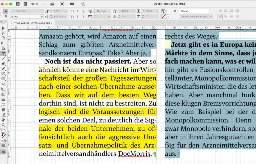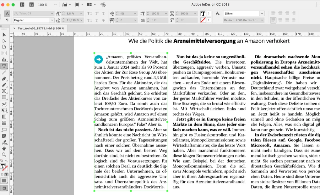 The Paragraph Style has a Hyphen Limit of 4 hyphens, Hyphenation Zone is 5mm, Language Deutsch 2006 Rechtschreibreform, Justification is Adobe Single-line Composer, Full Justify.