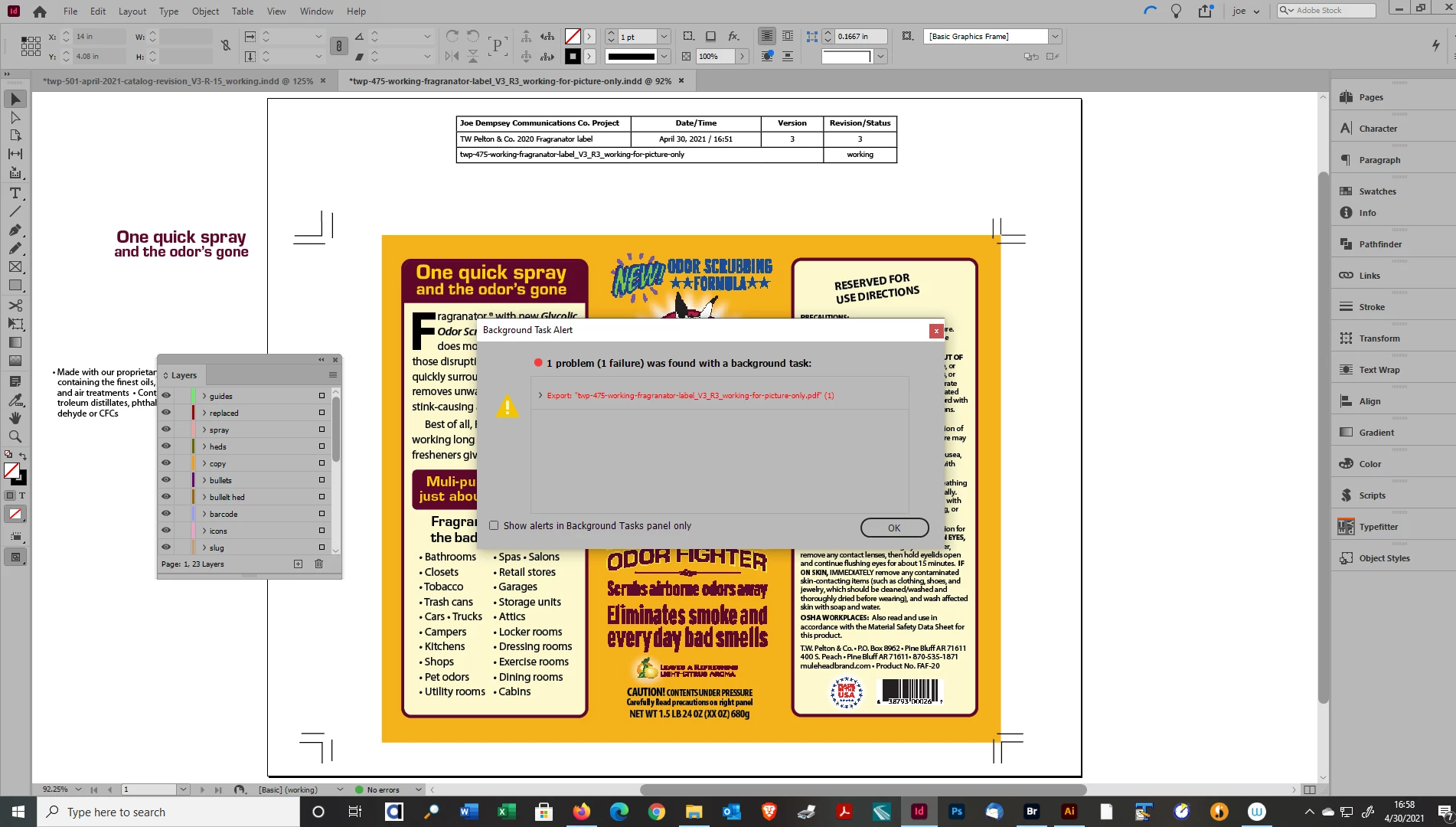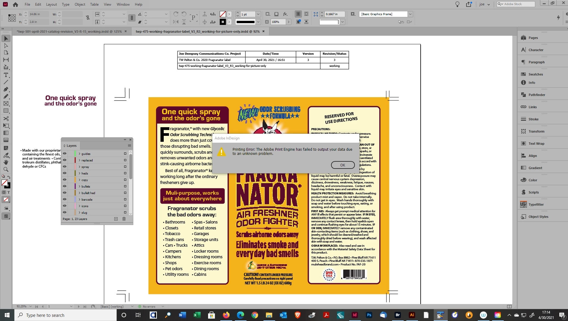 I am running InDesign 16.1/64. I am attempting to export a previously exported file to print quality pdf and get an error: "1 problem (1failure) was found in a background task." I also attempted to print to pdf and get: Printing Error: The Adobe Print Engine has failed to output your data due to an unknown proble. When I attempt to export it to JPEG, I get a blank white file. I deleted preferences earlier today and the program has been running fine until this issue.
