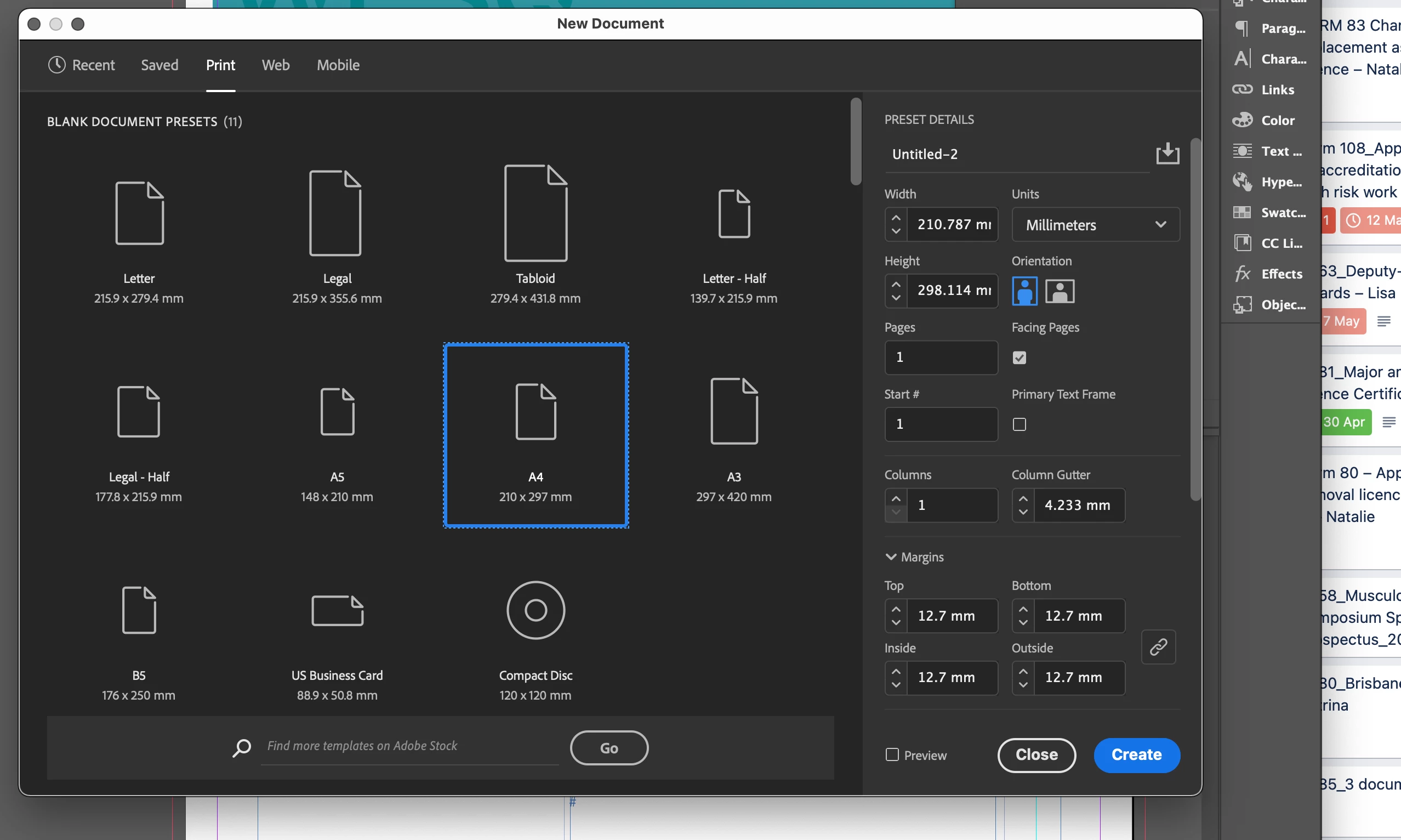 A4 size in InDesign showing 210.787 mm x 298.114 mm