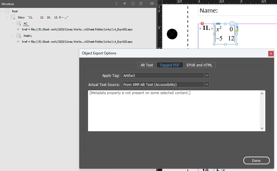I'm creating an accessible PDF using Adobe InDesign. I've inserted math equations and added Alt Text using Object Export Options > Alt Text > Custom.