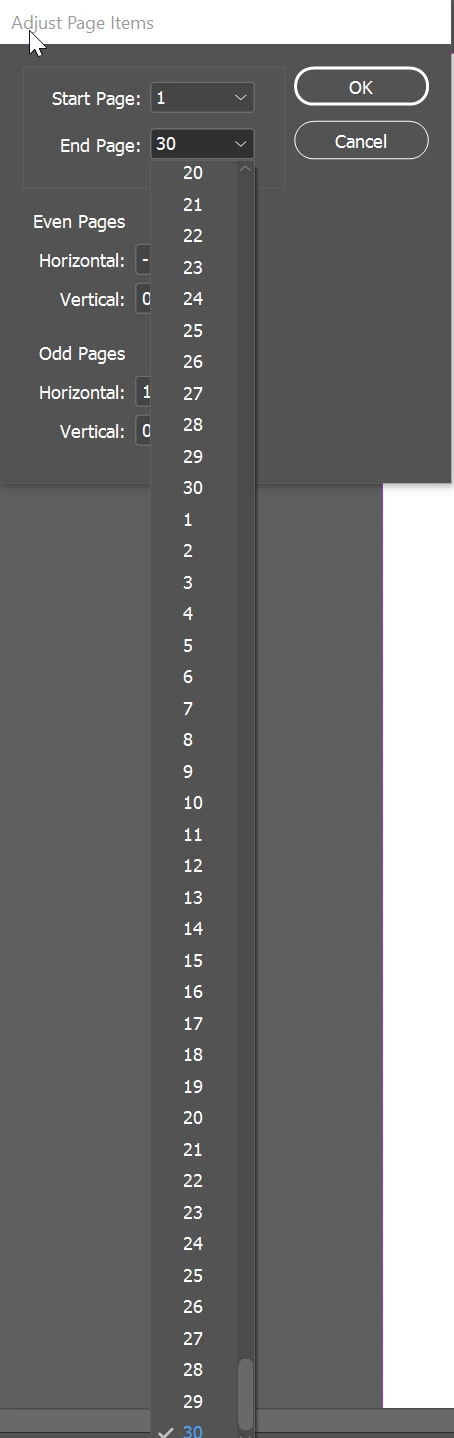 myAdjustPages(myEvenX, myEvenY, myOddX, myOddY, myStartPageSpecifier, myEndPageSpecifier);
