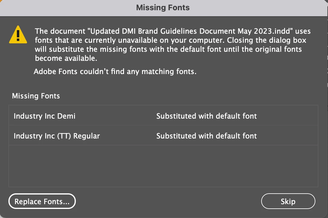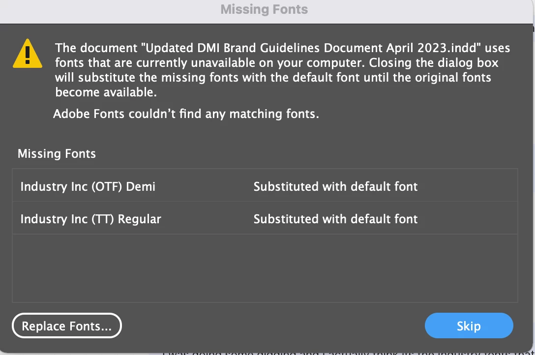 I currently use a MacBook Pro (16-inch, 2021) however when I sent the document to my colleague who uses Windows a box pops up saying "Cannot find or create the font Industry Inc Base, some characters may be missing etc.."