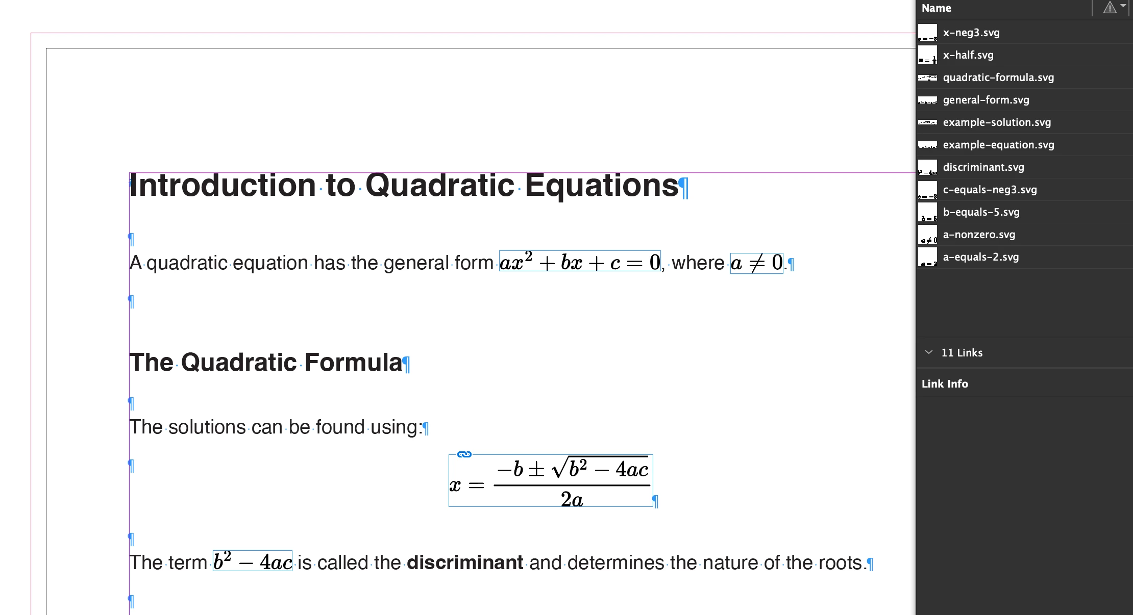 It works brilliantly. I basically give it a Markdown file with embedded LaTeX formulas, and all I ask is that you place that Markdown file in my InDesign file. Claude is exporting the LaTeX formulas to SVG, placing text with placeholders in the files in my InDesign document, and then replacing those placeholders with placed and anchored SVGs.