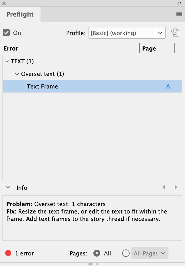 Error Message: Preflight: Overset text (1 characters)