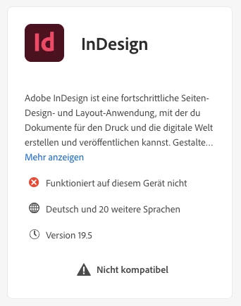 Ich wollte mir gerade Indesign runterladen doch leider ist die aktuellste Version nicht kompatibel mit meinem Mac und der Download wurde abgebrochen. Ich würde jetzt gerne die Version 17 installieren nur leider weiß ich nicht wie und wo.