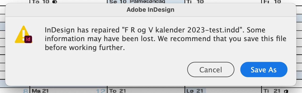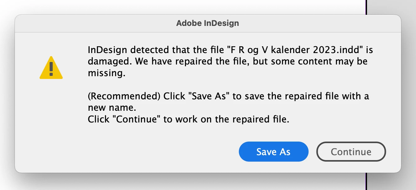 When the "damaged/repaired" file is saved, closed and opened again, another warning appears: "Indesign detected that the file "XXXXX" is damaged. We have repaired the file, but some content may be missing. And then I'm recommended to "Save As".