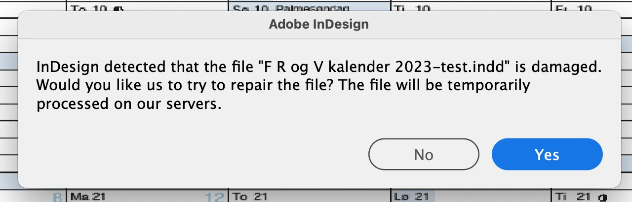 After updating to InDesign 2023 (v18.0) (running on OS X Monterey), all files - as in every single one - opens with an error that says: "InDesign detected that the file "XXXXX" is damages. Would you like us to try to repair the file? The file will be temporarily processed on our servers".