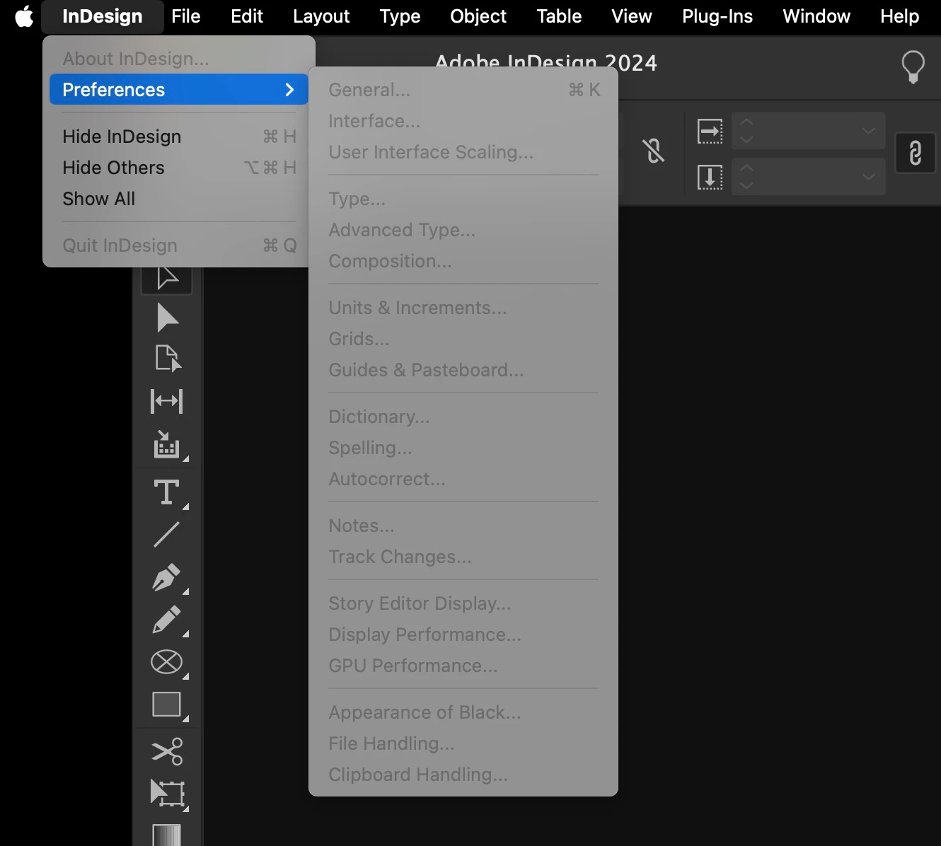 All the menu panel options are greyed out on InDesign 19.4 on macOS 14.5