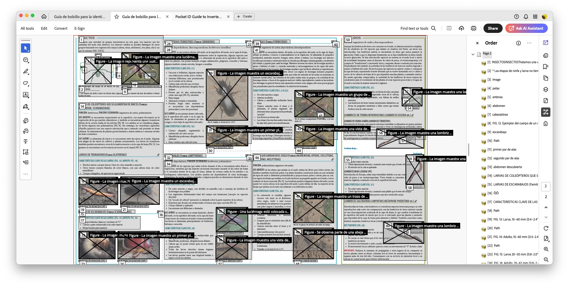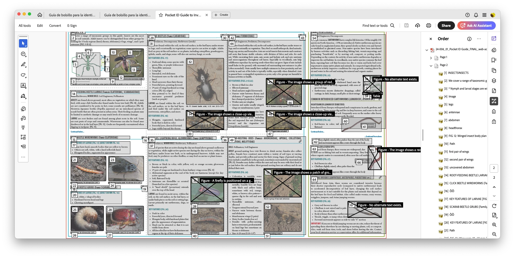 We used the English version as the basis for the Spanish file, so I'm even more baffled than ever. All of the images are grouped with captions then anchored in the text where referenced, the same for both language versions. They're all tagged as Figures, too, so there's no reason for Acrobat to be treating them like Artifacts.