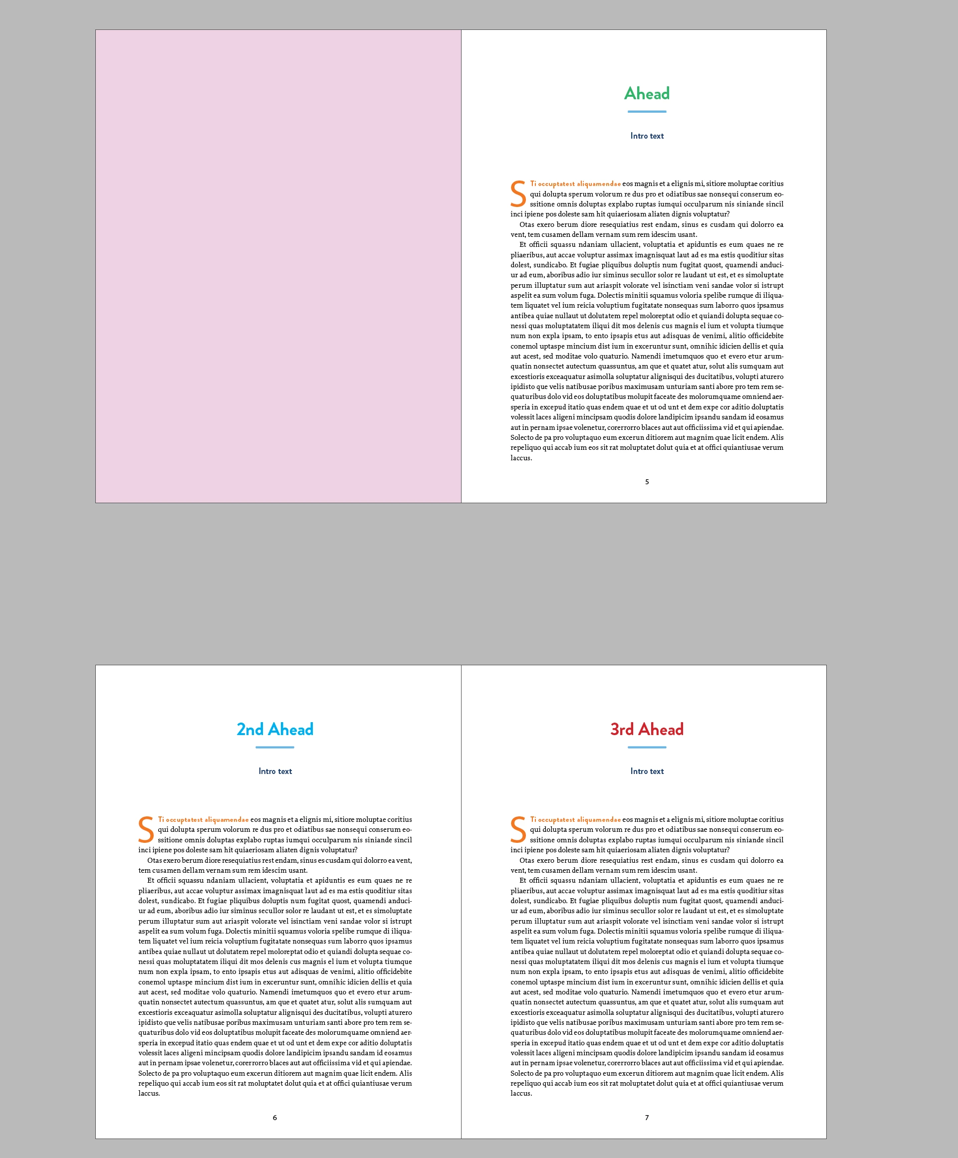 Yes, each recipe title has the Ahead style applied to it. The layouts above are just an example. There are 30 recipes total. As I said in my initial post, right now to get the different colors in the Aheads, I'm manually applying the colors to every third ahead with a character style but I'd like it if I could GREP it in, that way even if the recipes move around the formatting stays correct within the pattern.