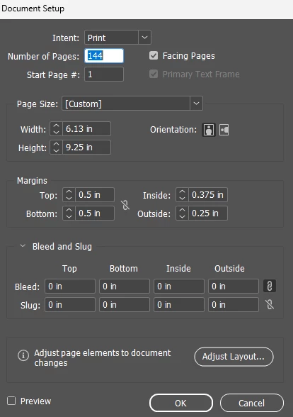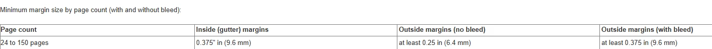 When I designed my book, it started out as 6 x9 inches with 144 pages. I set the top and bottom margins to 0.5 inches. Then I set the other margins as per KDP's online guide (screenshot below): inside 0.375 inches and outside 0.25 inches. There’s no bleed as my content doesn’t extend over the margins. I don’t have columns.