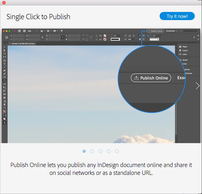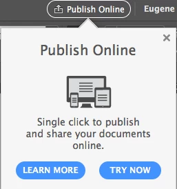 On the first export of a PDF from InDesign this monstrosity pops up (takes 1 second exactly to fully appear) and it takes over a very large portion of the screen smack bang in the middle - telling you about "Publish Online". however I'll get to this soon
