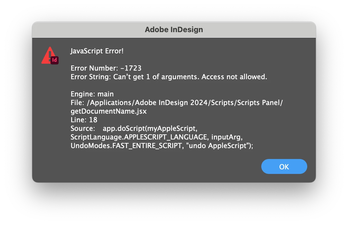We are trying to get an argument using applescript and following code gives us an error. The thing I should emphasize is, this error only occurs when our plugin is installed. (My company develops a InDesign plugin and this piece of code doesn't even interact with our scripting functions). I checked our script providers and all the related implementation. Couldn't find something that blocks AppleScript. Other applescript that we call through same mechanism, doesn't have this problem. Only this "item 1 of argument" part. Any pointer would be helpful.