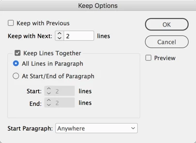 - Then, click inside the first paragraph and turn on "Keep with Next 2 Lines" (the default, or even just 1 line will work) as shown in the screen shot below. This will force ID to jump the 1st paragraph to the top of the next column if the any part of the 2nd paragraph ends up there. Don't apply the Keep with Next Lines setting to the 2nd paragraph, only to the first.