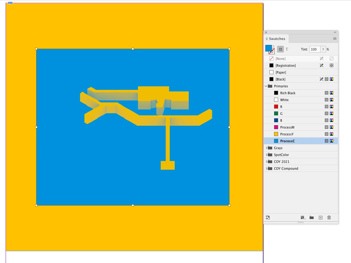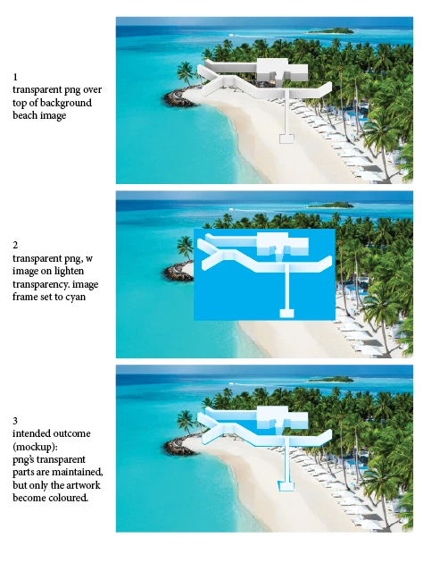 I imagine the trick is playing with transparency modes in with the Effects panel--but no luck I could figure out. Typically when I want to do this to a black and white image, I'll give the image frame a fill, and then double click to make only the graphic take on transparency of the background fill. But in this instance, I'd like for the illustration to still take on the Lighten transparency, but for the transparent background to ignore it. I'm trying to achieve a look of a coloured block sitting atop of the background image. Shown below.