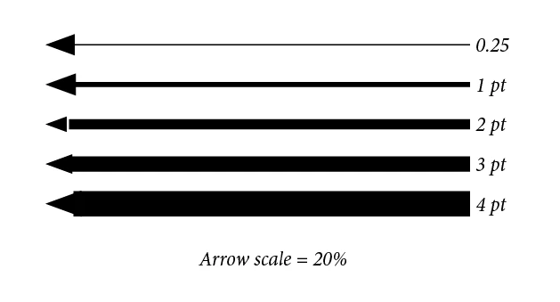 This is obviously enlarged. But at 1 point size and smaller, the arrows are actually larger than at greater point sizes, and cannot be reduced in size beyond the sizes shown. Thus, making a fine point arrow on a 1 point or smaller line seems impossible. An arrow at 20% size gets progressively smaller as the line weight is dropped from 4 points, to 3, to 2, but then gets bigger at 1 point and smaller.