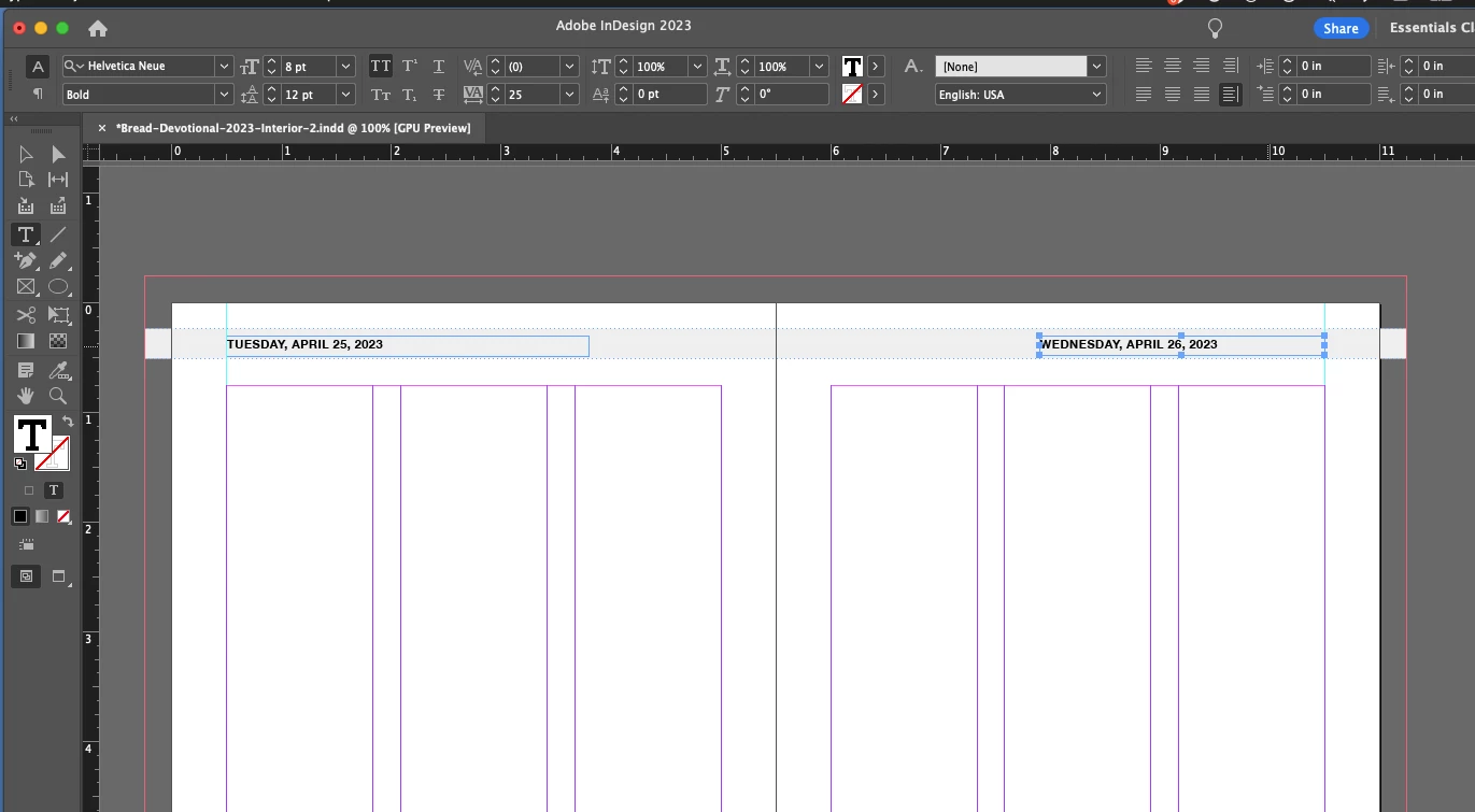 I'm working on creating a 365 day journal, with dates on each page formatted (Tuesday, April 25). In my master pages, I've created two text boxes at the top of the page - and set the paragraph alignment to "Align Away From Spine", linked them, and then on the doc, autoflow placed in my Excel spreadsheet of dates, which populated all 365 pages.