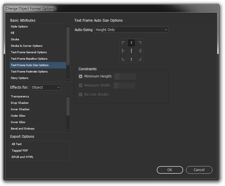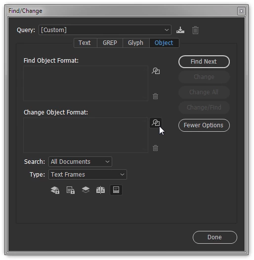 Set the Type: menu to Text Frames and click the icon next to the Change Object Format field: