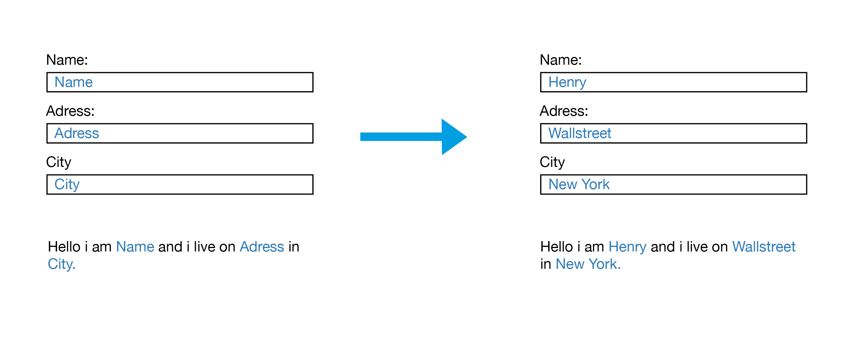 So you see the form and underneath it a text box. What i want is that when i change the text "Name/Adress/City" in the form to for example "Henry/Walllstreet/New York" it changes automaticly in the text box.