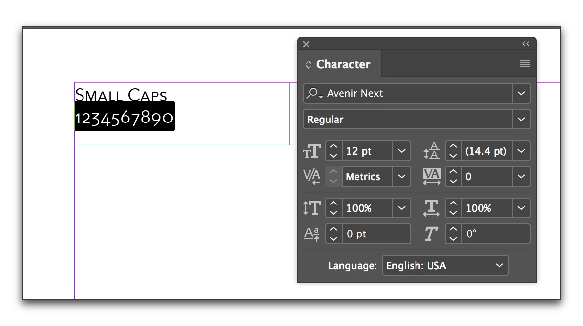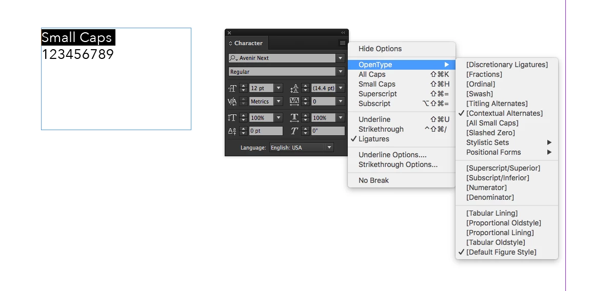 It appears that Avenir Next includes both small caps and oldstyle number OpenType features, but I cannot use these in InDesign CC 2017. All OpenType features are bracketed/unavailable under Character Palette > Opentype >... Does anyone have any suggestions for me?