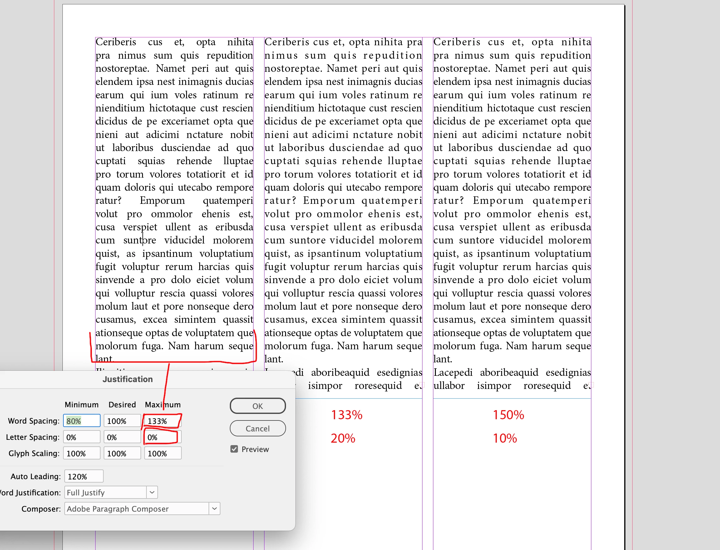 and the right column is Word Spacing Max 150% with Letter Spacing Max 10%