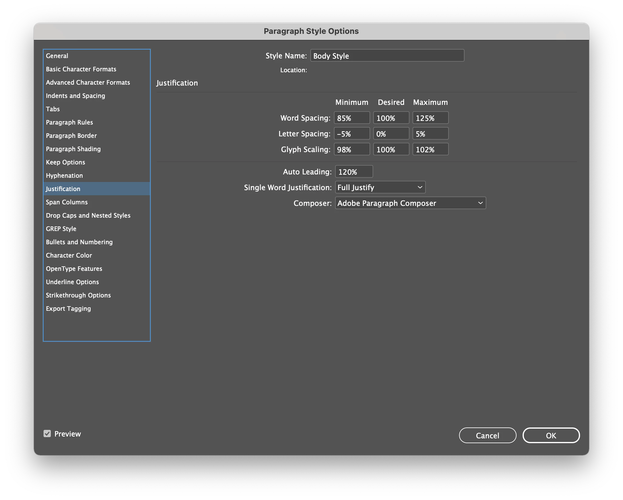 What are the best Full Justification settings for a paragraph style so that things don't get too wonky. Here's what I'm currently using. Most of the time these settings are fine, but every now again the letters in some words get a little too squeezed. Thanks!