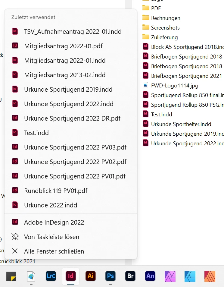 (btw. as I rightclick on the taskbar icon of InDesign all my exported PDF-files are also listed there (but truely not able to be opend by InDesign) and they carry the ID-icon (in WIN-explorer they carry the Acrobat-icon) - absolutely weired , or?)