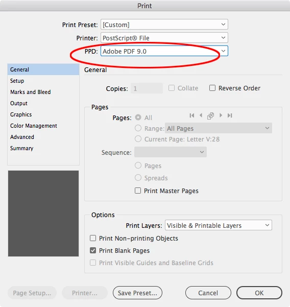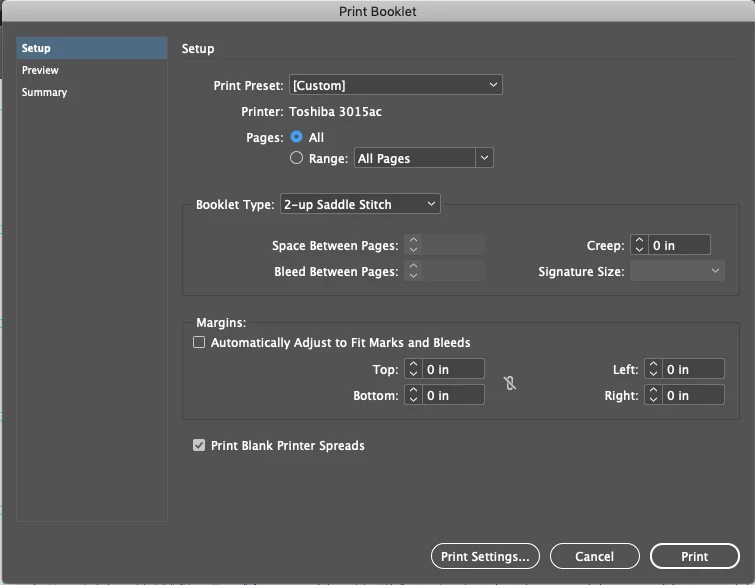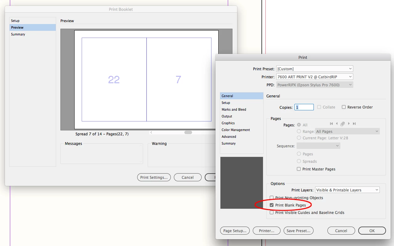 I have a seies of booklets that I regularly print to a toshiba 3500AC using the "print booklet" option in Indesign. I have one 28 page booklet that for some reason the 7/24 spread prints blank. It is there on the preview but gone when it comes out the printer. None of the other booklets I print have this problem, just this one file. If I export to PDF it will print from Acrobat but the margins are larger and leaves an undesiered white area on the spine.
