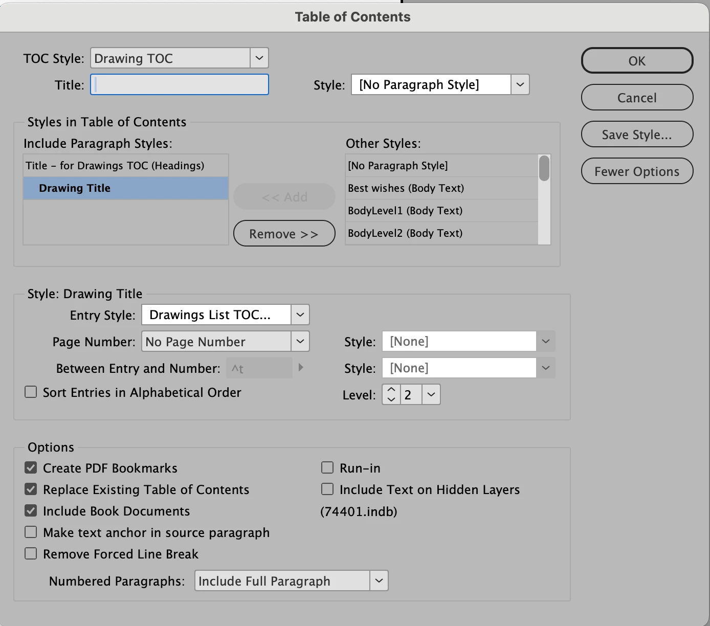 Ive got strange issue I've never encountered before. I had a TOC misbehaving (with regard to the bookmarks it made). So used the Book function to import the TOC style from a properly behaving document.