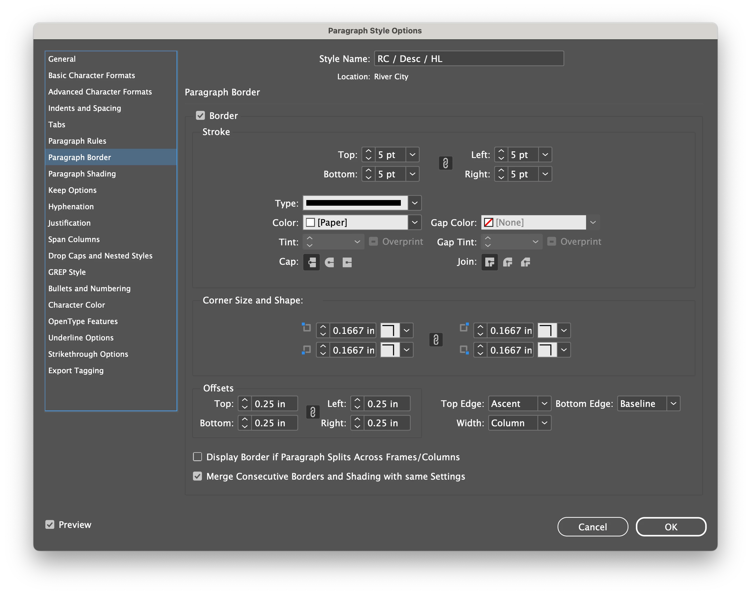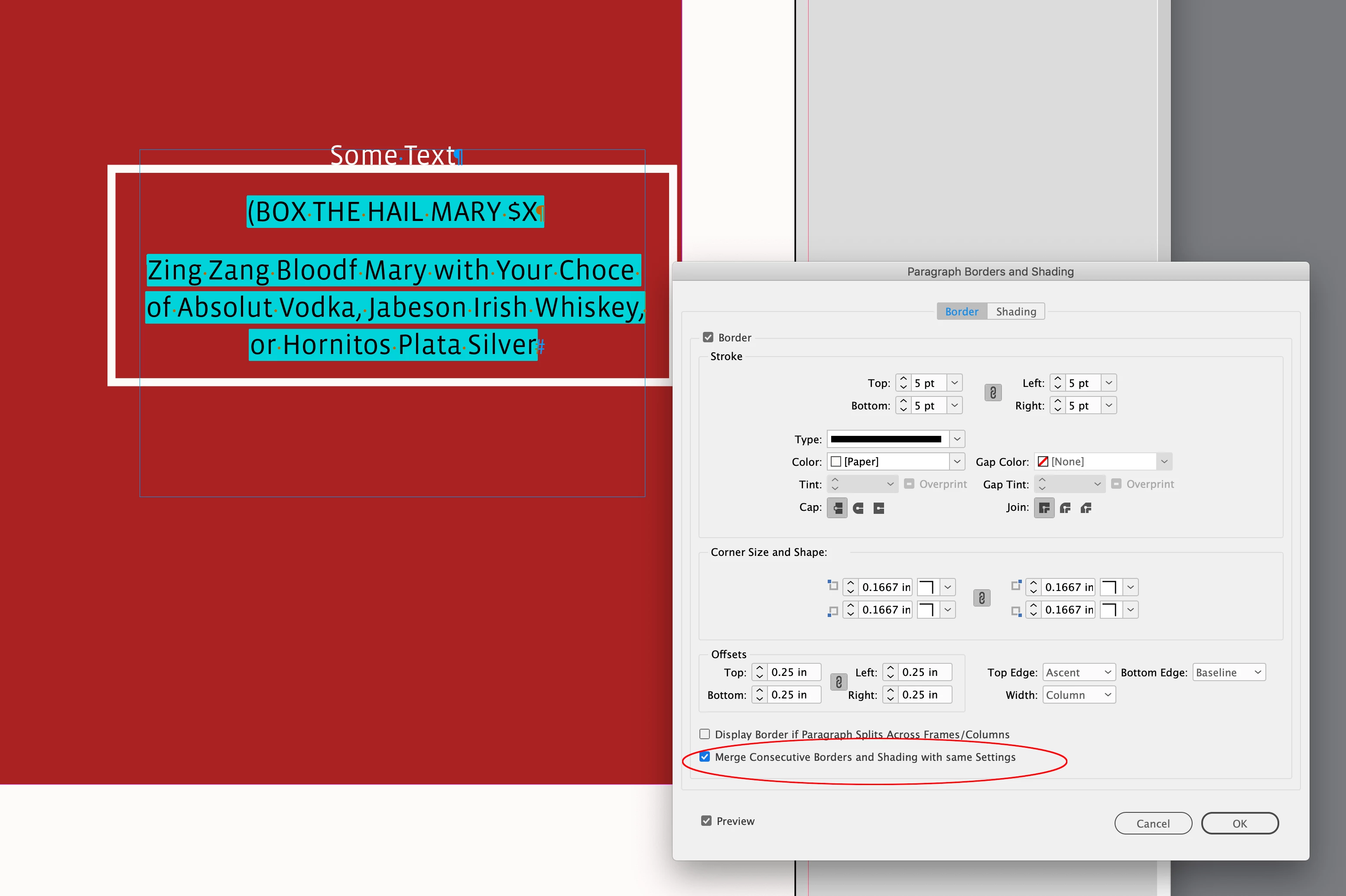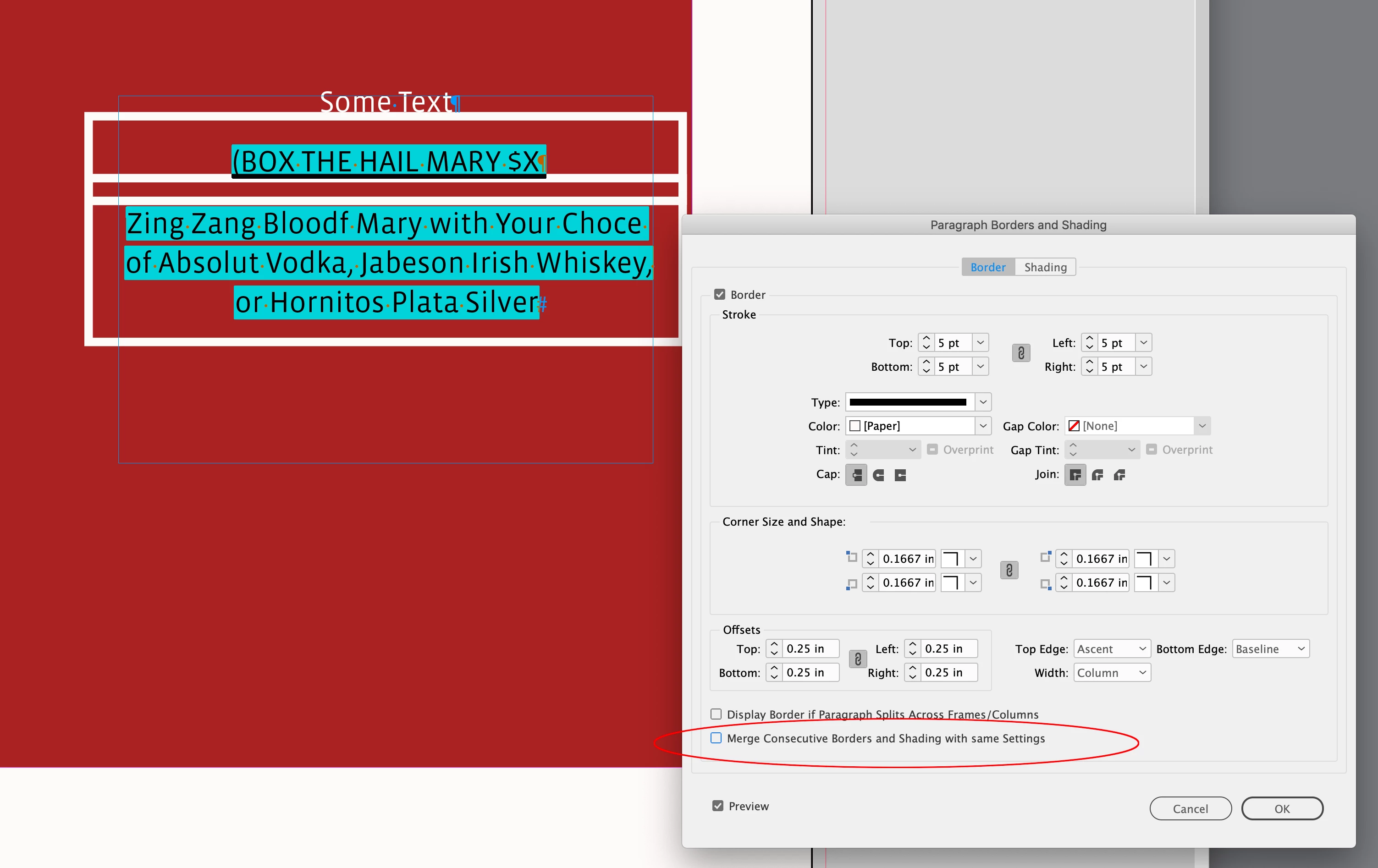 Not sure why this does this. Same border settings for both Item & Description, yet the block does not merge. There is clearly overlap, so they should merge. Other styles in this document merge fine. Just this particular one does not. Styles are based on Item & Desc. If I change the Desc style to be based on Item / HL, it will work, but then it doesn't update properly should I change the base Desc style.