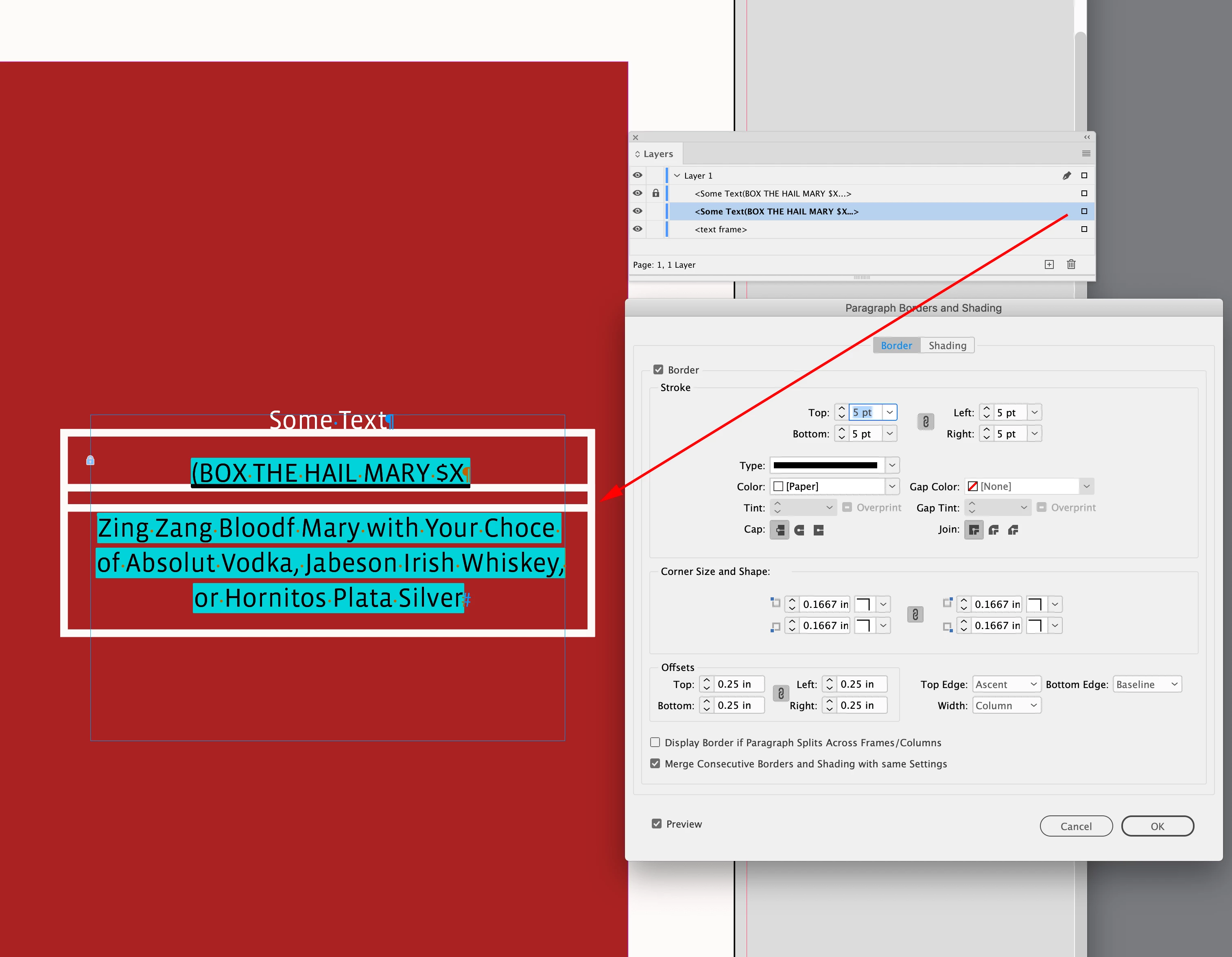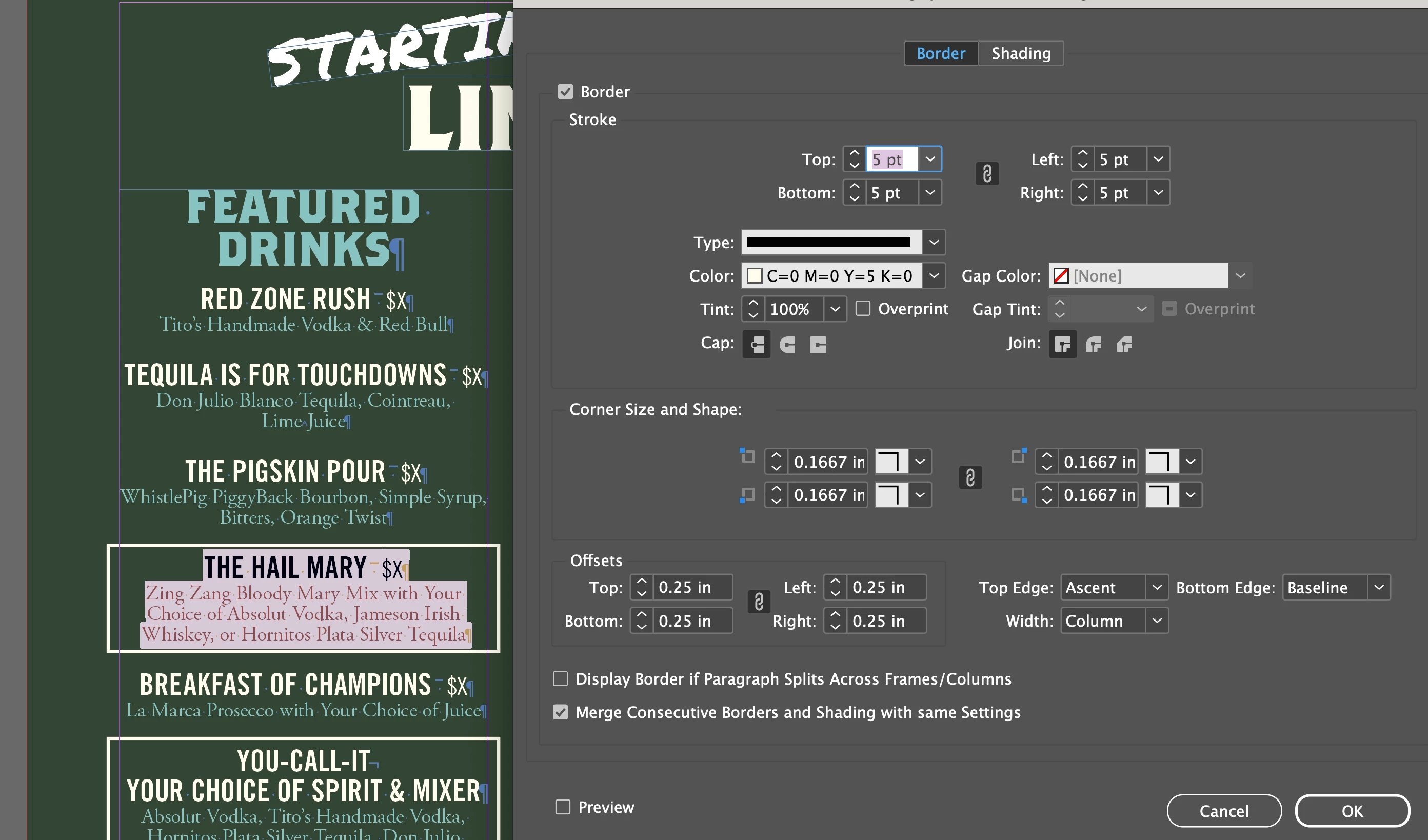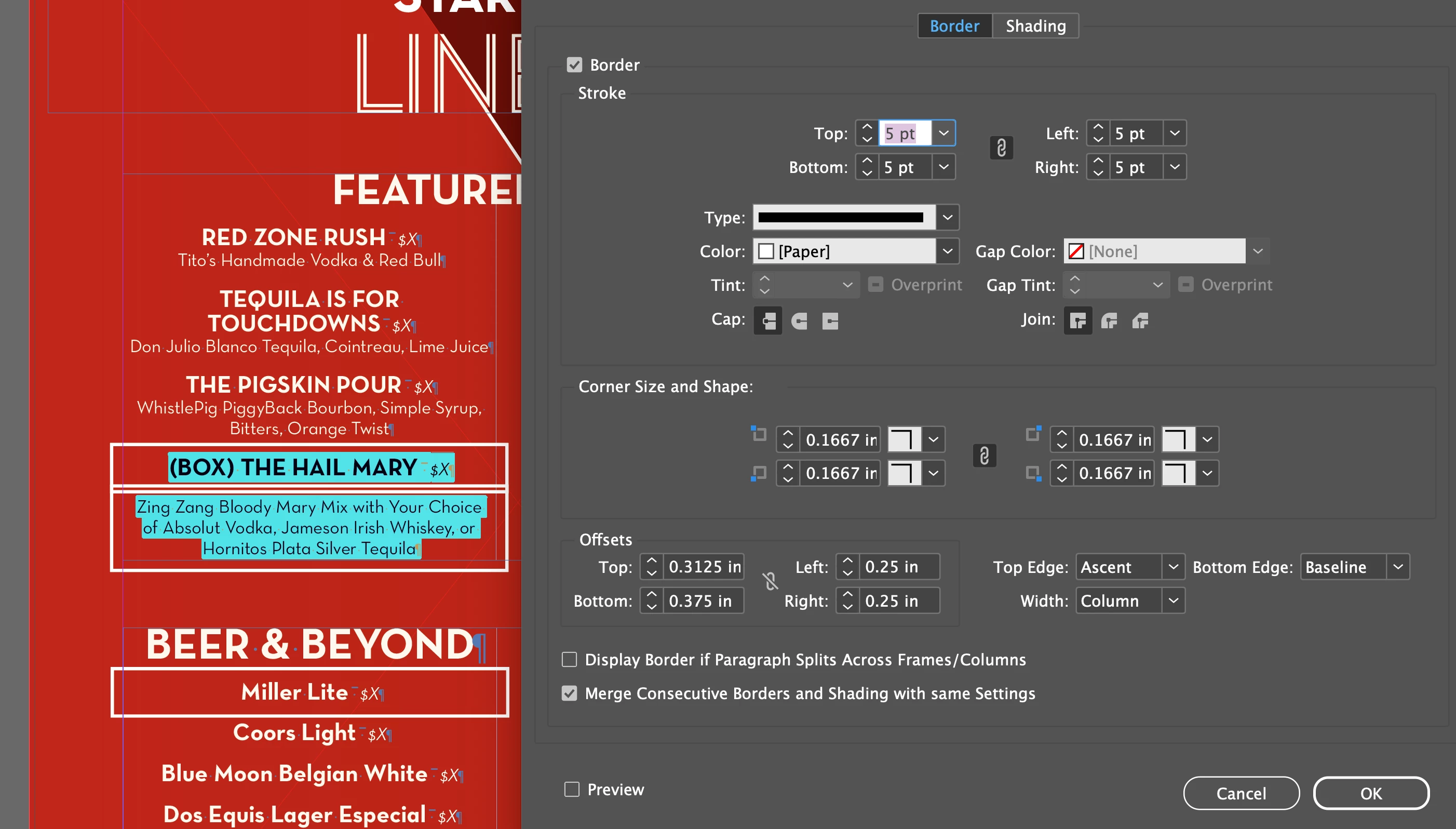Not sure why this does this. Same border settings for both Item & Description, yet the block does not merge. There is clearly overlap, so they should merge. Other styles in this document merge fine. Just this particular one does not. Styles are based on Item & Desc. If I change the Desc style to be based on Item / HL, it will work, but then it doesn't update properly should I change the base Desc style.