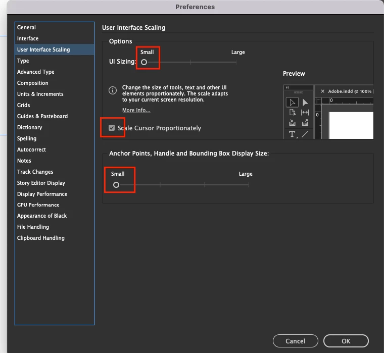Glad to hear that turning off GPU helped you. Sorry about the other trouble you are facing, @LeCharly46. You may try changing the UI scaling to small from InDesign Preferences, then restart InDesign, and let us know how it goes. Also, could you please confirm the screen resolution of your Display?