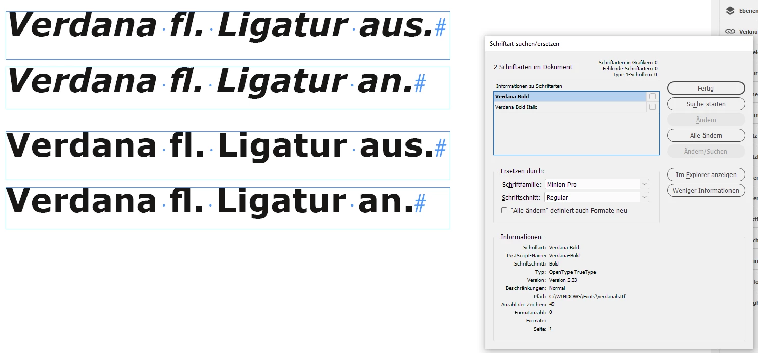 Hallo, InDesign 2023 kann die Ligatur fl in der Schrift Verdana bold und Verdana bold italic nicht darstellen. Ein Bug!