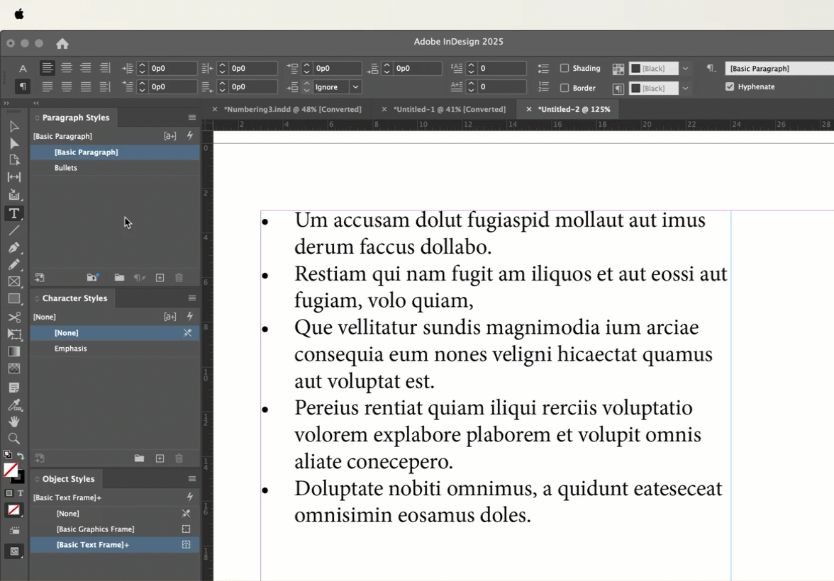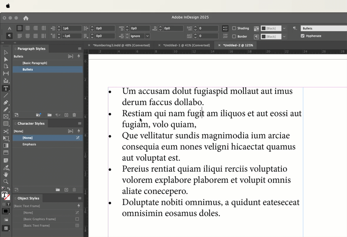 So as an example, I have a P-style called body and 2 C-styles called blue and magenta. This lets me keep the paragraph style the same but alter the colour. However it seems overly labourious to create C-styles just for the bullets so they match.