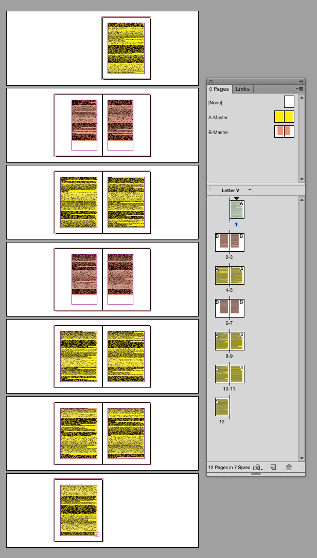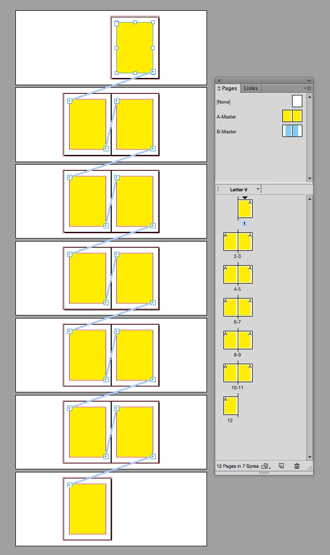 Then drag and drop B-masters (which also have primary text frames) on to 2-3 and 6-7, the primary frames from the two masters are smart enough to re-thread themselves: