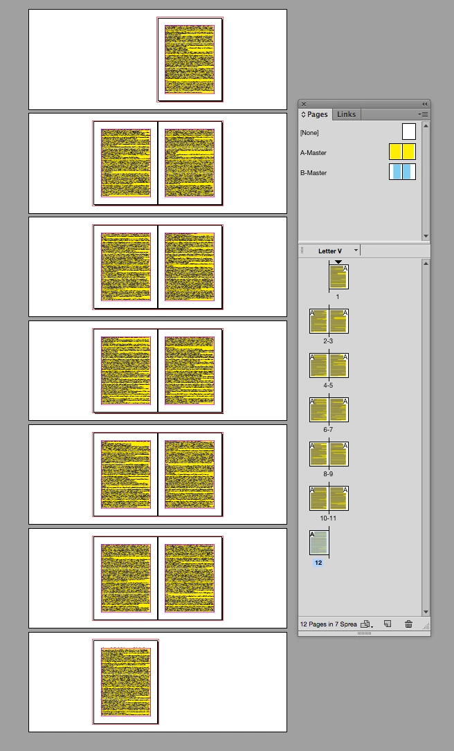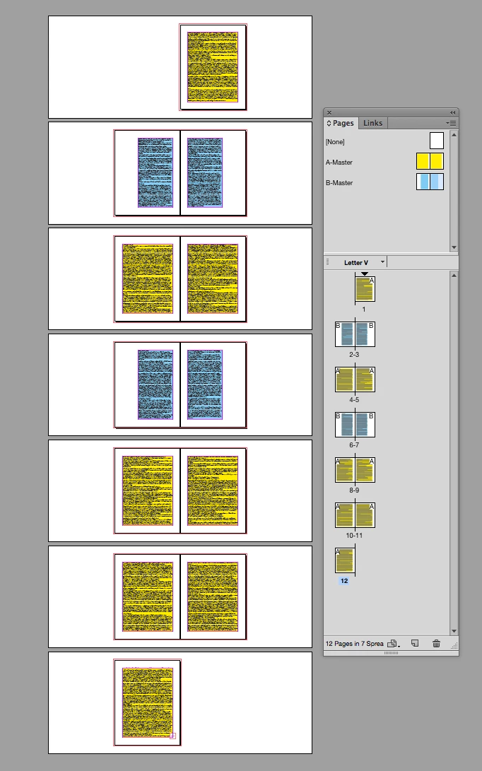 Here I've set up a 12 page doc with all A-master pages that have primary text frames and they are threaded.