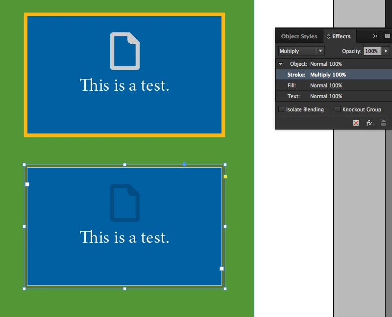 I'm hoping that I'm missing something obvious. I'd like to keep this with everything in neat, single, self-contained, and auto-fitting boxes. The effect I'd like is for the stroke of the text box only to blend (multiply) with a background.