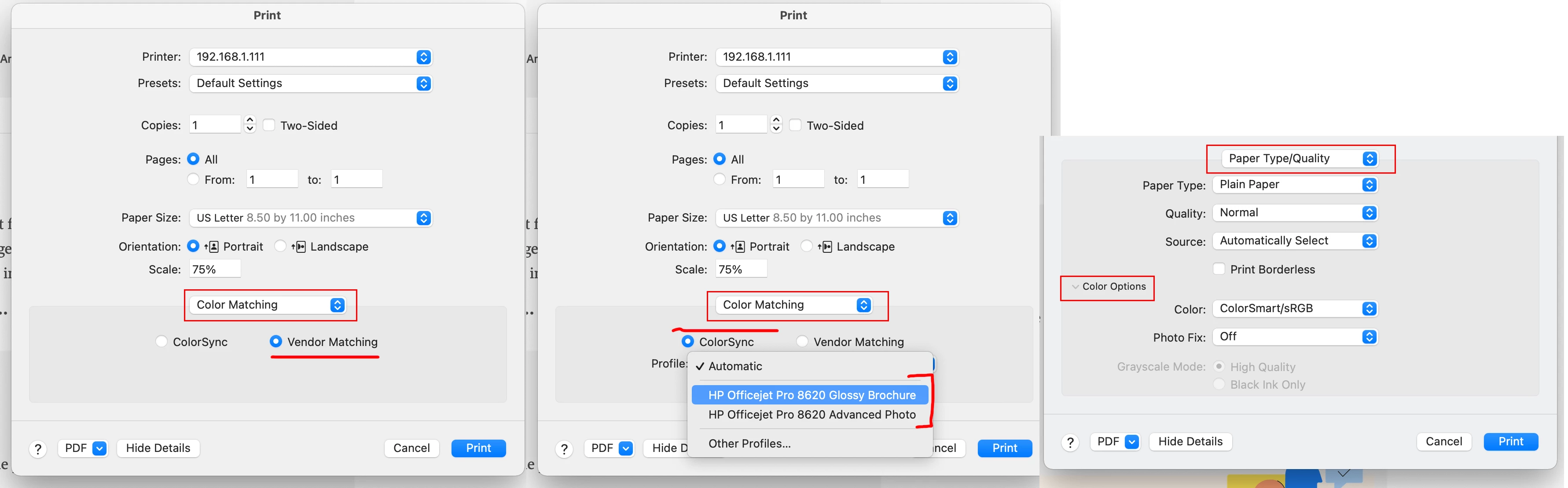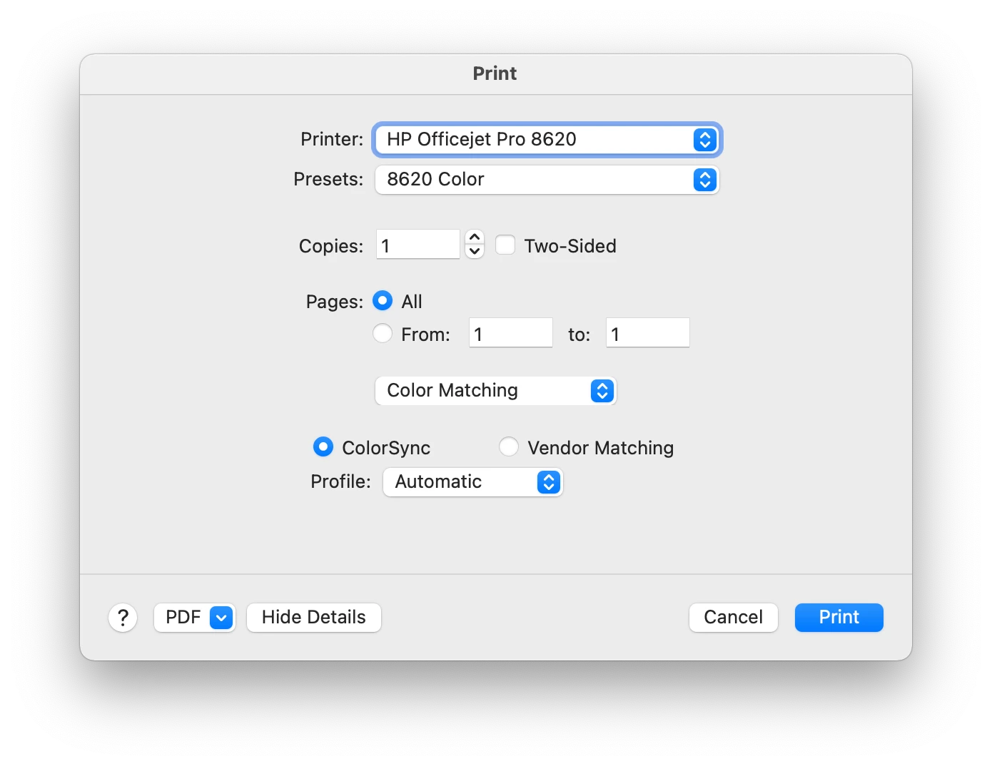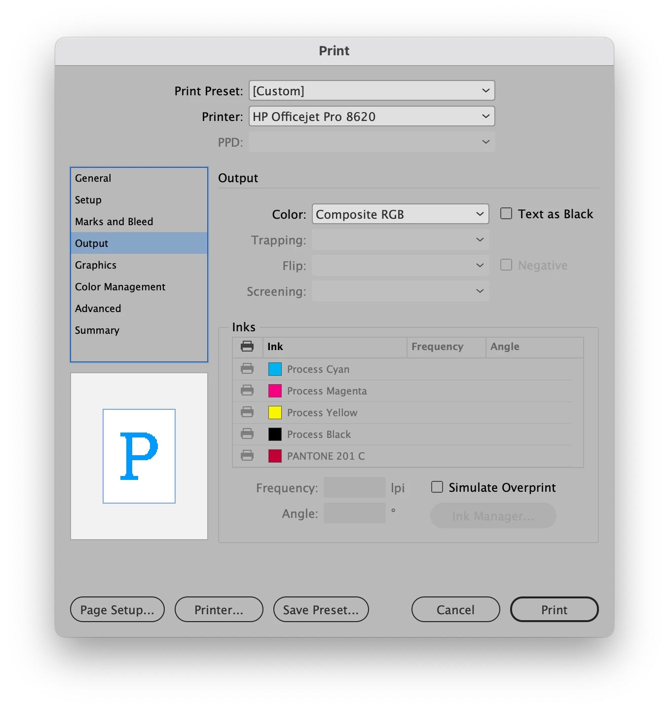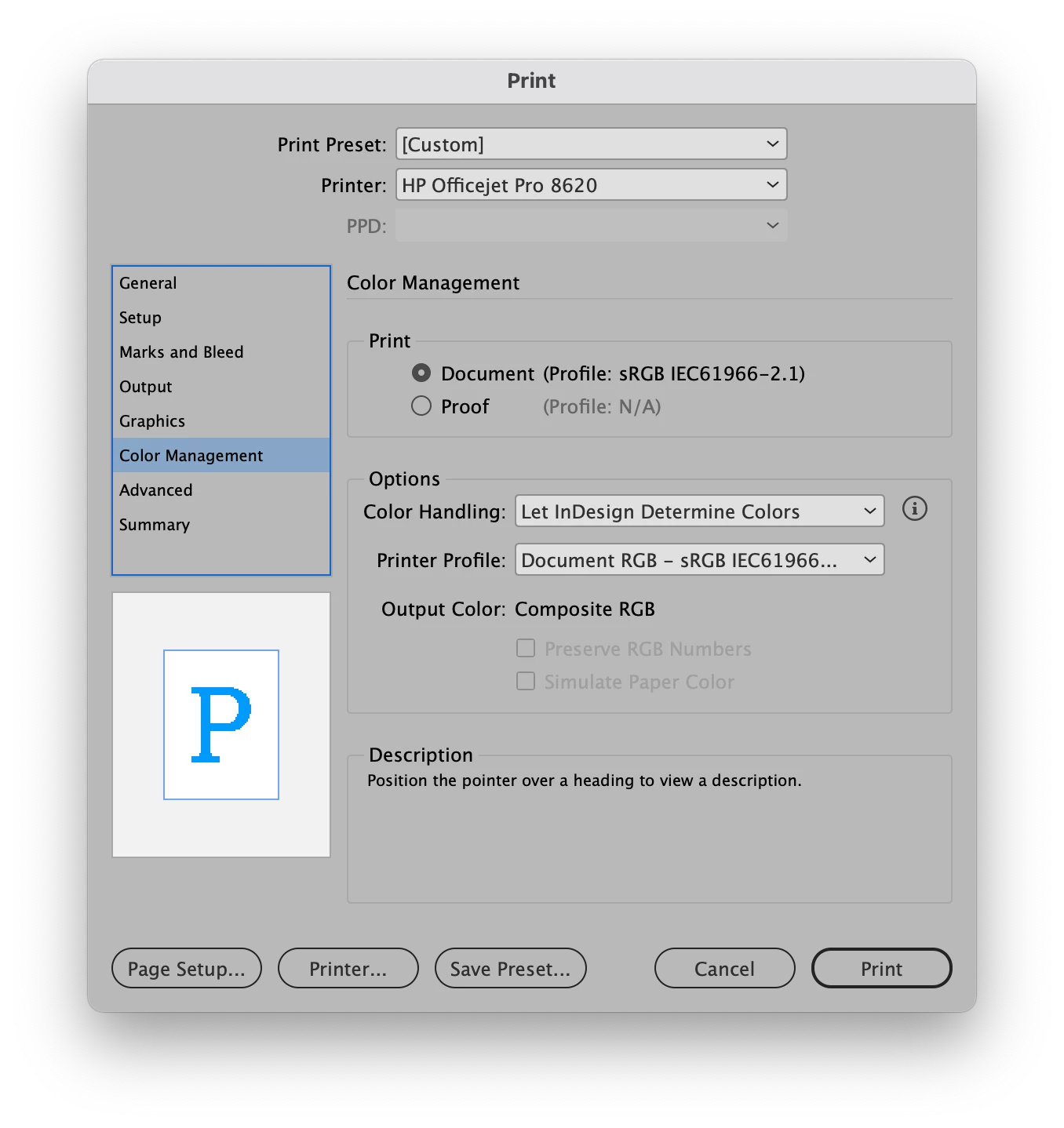 I'm running MacOS Big Sur, latest InDesign, printing to an HP Officejet Pro 8620 (I know it's RGB, but it used to print the colors just fine).