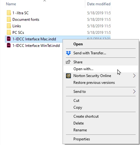 2) Open File Explorer. Navigate your way to one of your .indd files. Right-click on that file and select the Open with... command on the flyaway menu, as shown below.