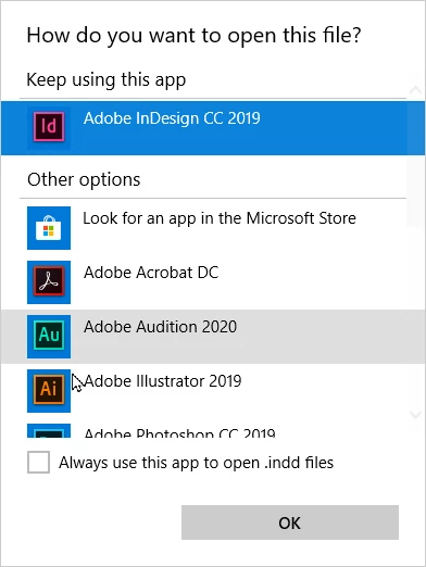 4) Navigate your way to where you found your Indesign.exe (v15.1.xx) file, and double-click it to make the selection. Select the Always use this app to open .indd files check box, then click the OK button. Then see if InDesign opens your file.