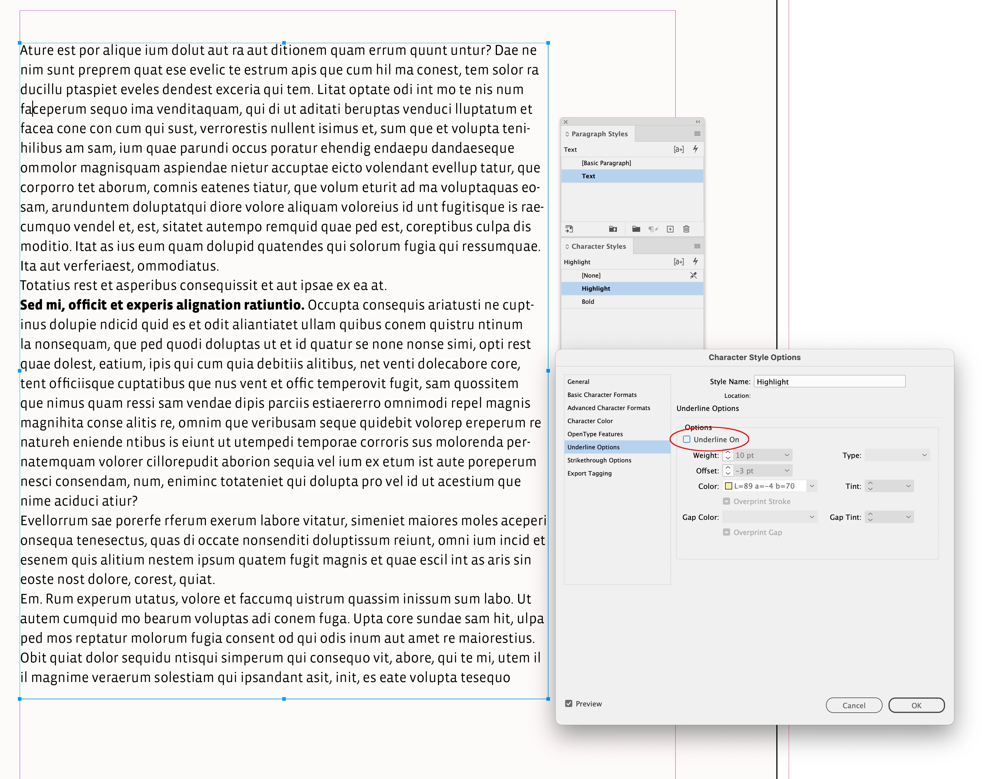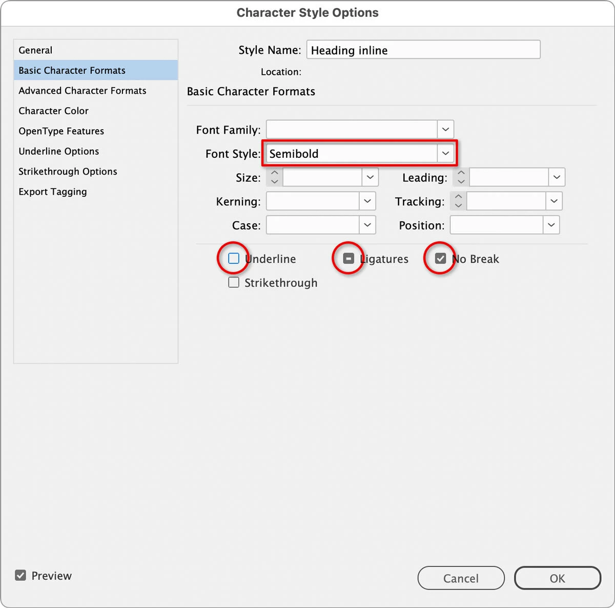 You can see in the picture that when this character style is applied, Underline and Strikethrough will definitely be turned off, the text’s current Ligatures setting won’t be changed, and No Break will definitely be turned on. If you want to cycle through those three options for a check box, click it until it’s set the way you want.