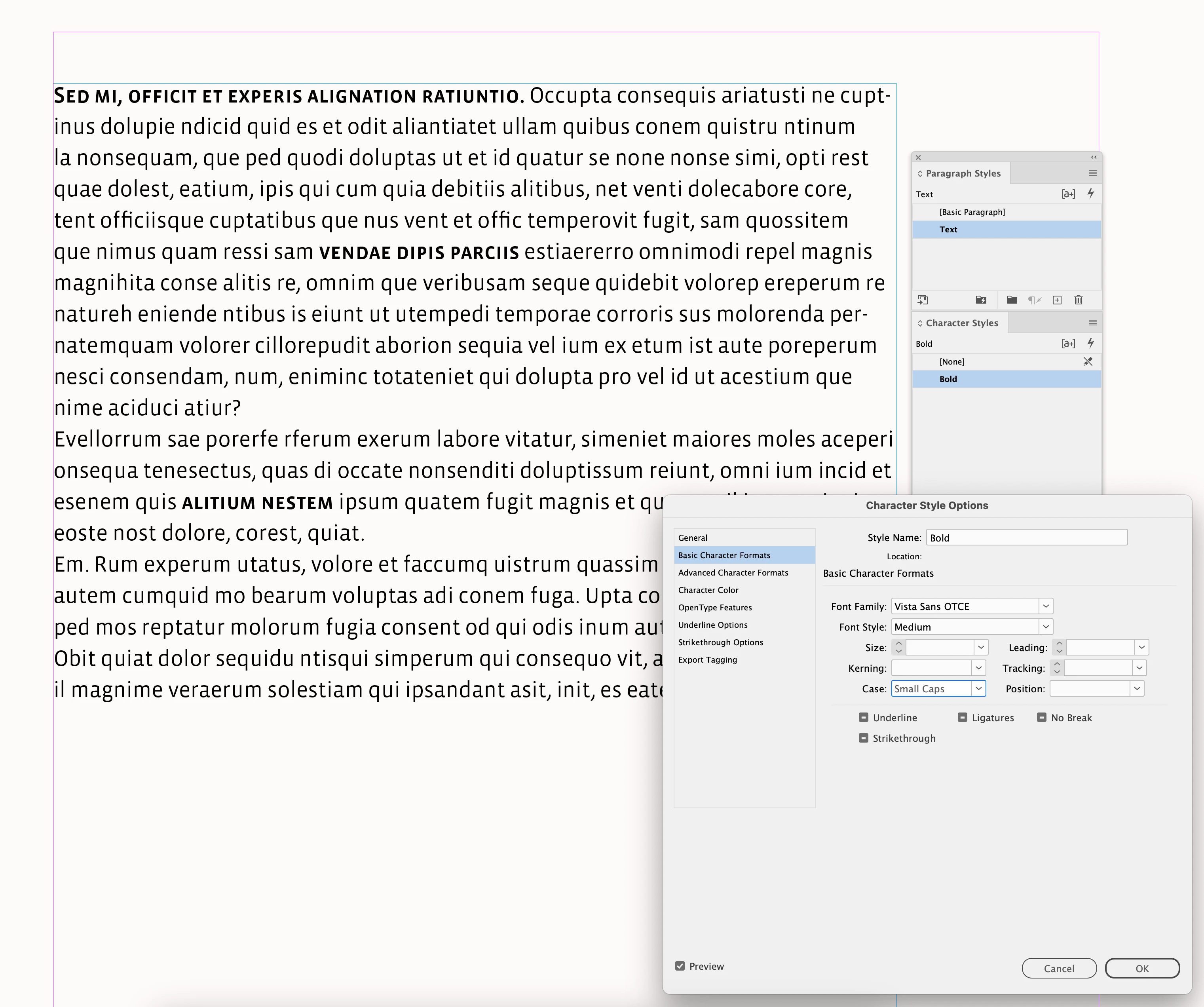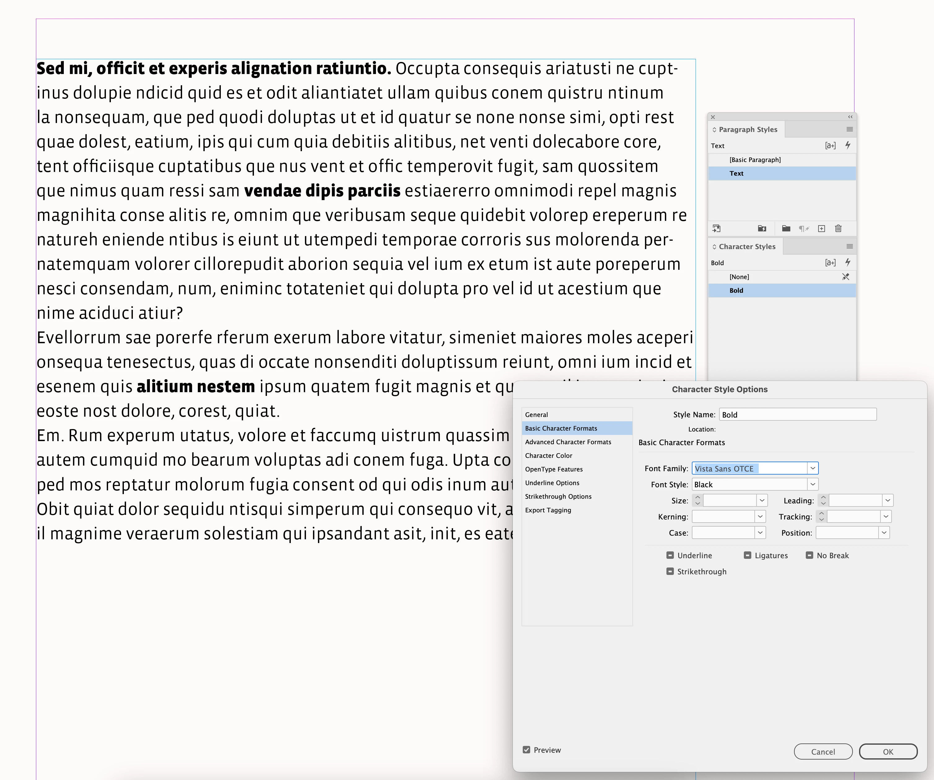 The picture below shows what to look for. Notice that in the first group of Basic Character Formats, everything is blank except Font Style, which is Semibold. That’s because I selected only Semibold, which means when I apply this character style, the only thing that changes is that Font Style becomes Semibold. Because Font Family, Size, etc. are blank, applying this character style won’t change those values, they stay as is.