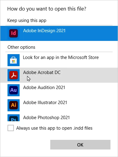 I updated to InDesign 2021 (16), but have left 2020 intact. Now I cannot change the default program in Windows 10. The program does not show up in the "Default apps", and even if I right click and choose the correct file, it does not register. I have to open 2021 and then use the "open file" option. There is no way to click on an InDesign file and have it default to 2021.