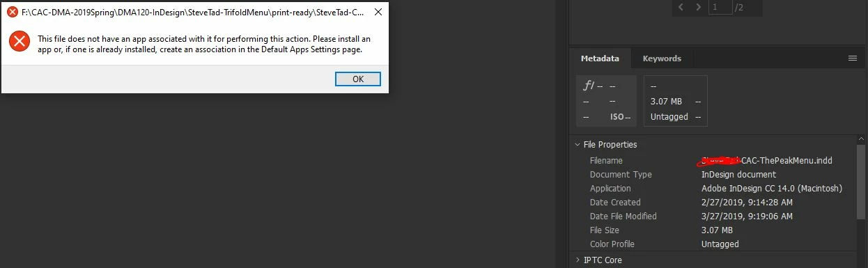 Hello, I am having an issue opening an InDesign file pre-update, is there any way I can open it up? I keep getting this error message: (incase you cannot read it: This file does not have an app associated with it for performing this action. Please install an app or, if one is already installed, create an association in the Default App Settings page.) It is a .indd file.