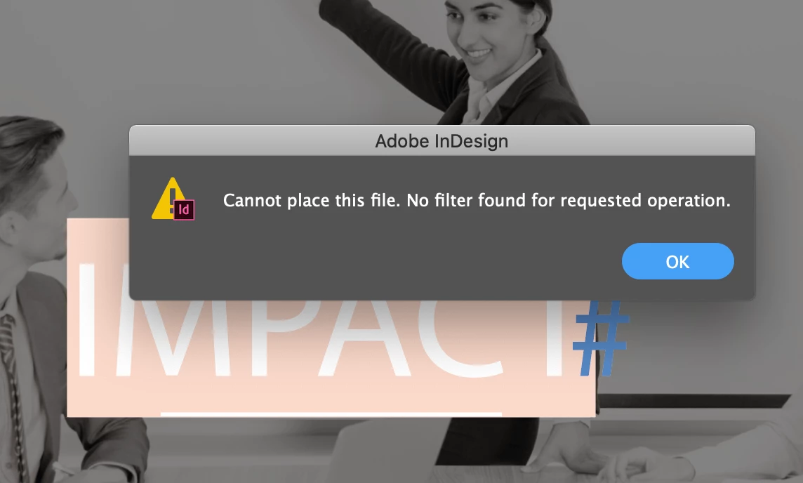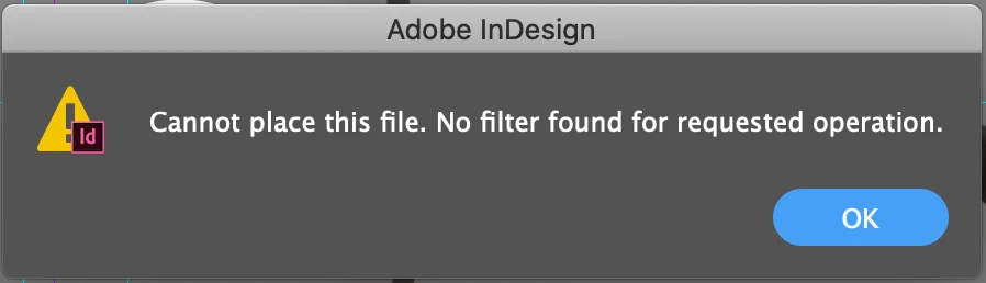 Although your recomendation were very precise, what I found, (and my mistake for not providing the whole picture on my issue) and I think this will be helpful for the community, is that on the project that I am working at, implies to do some re-work on some old Indesign files that had embedded Flash files within. That being said, when I open those files and tried to re-link the audio files to the 'new' version of my Indesign file, seems that the program 'corrupts' the files and does not allow them to be uploaded anymore back into Indesign, hence the message of 'No filter found for requested operation'.