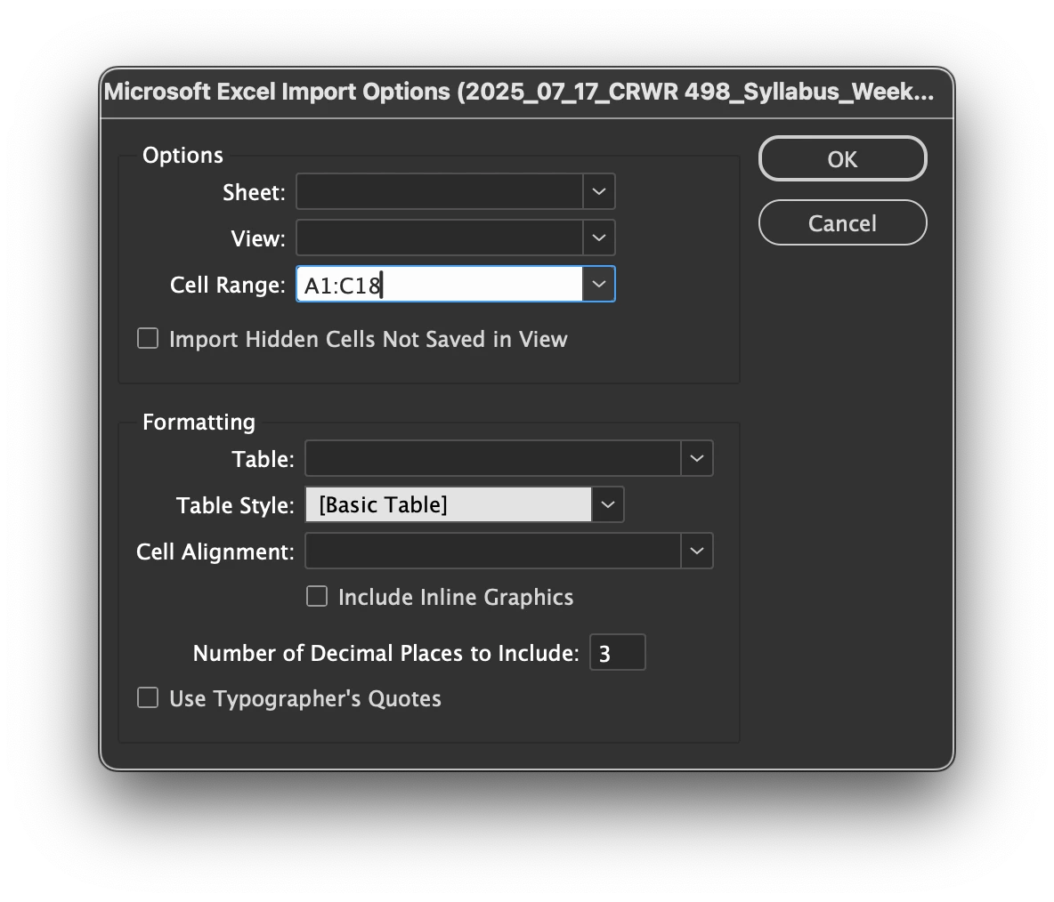 I'm venturing into new territory and trying to place an .XLSX table into my .INDD class syllabus.