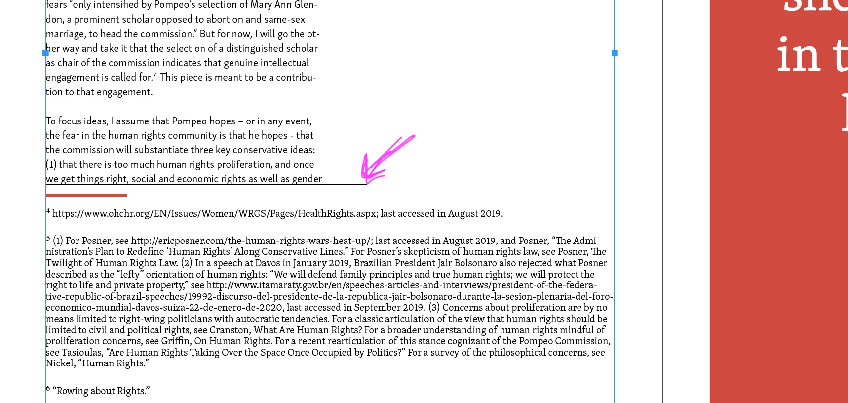 For whatever reason, a random black horizontal line has appeared in my ID document, and I can't seem to remove it. It's appearing at the bottom of the text of the left-most column of a two-column page, yet it seems to extend beyond the column divider.