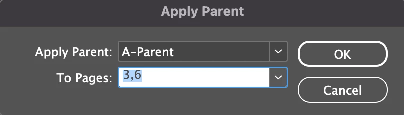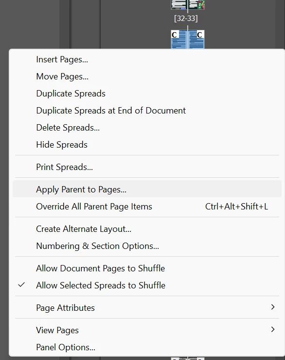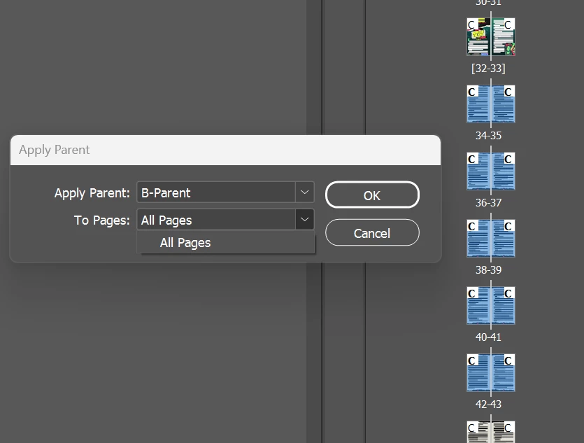 I have a 200+ page document I've been formatting only to discover that I cannot apply my parent pages to selected pages. I have multiple authors who need specific header names on their works, and I do not want to click and drag the parent pages 100 times 😞 The bottom of the file does allow me to right click and apply parent to selected pages, but the top does not.