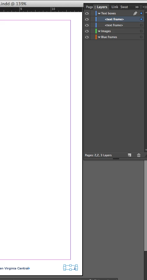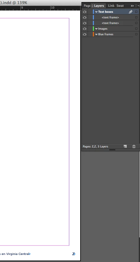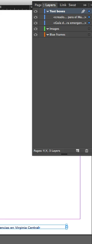 I got a file from a client with a lot of master pages. Now, what puzzles me is that at a point the designer used a Master page (Title on Bottom - Y) to add the text on footer, which footer is then used on the rest of the master pages. Each master page contains three layers: Text Boxes, Images, Blue Frames.